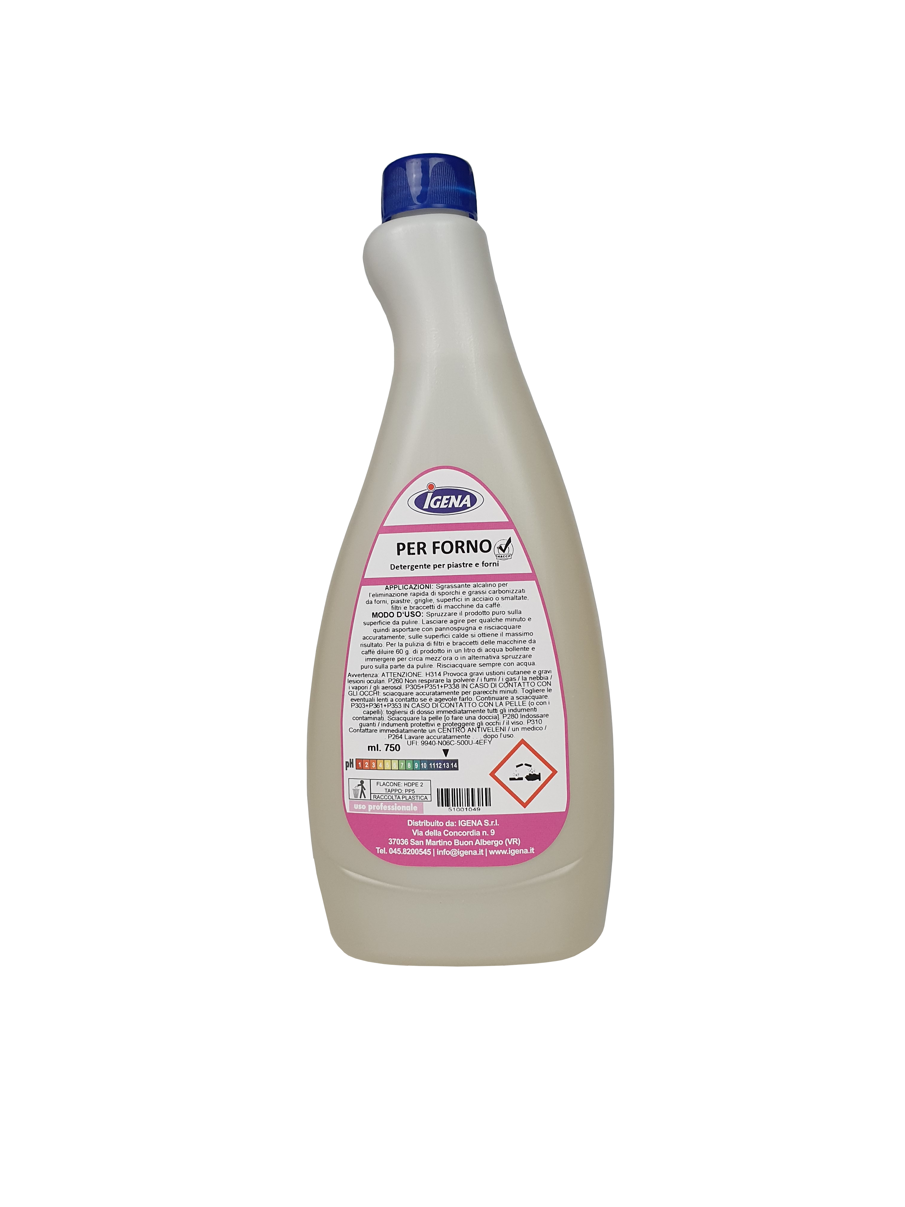 IGENA PER FORNO è un detergente a base alcalina studiato appositamente per la rimozione rapida di incrostazioni e residui carboniosi da: piastre di cottura, forni, grill, filtri, e braccetti delle macchine da caffè. Scioglie ed elimina olii e grassi sia di origine animale che vegetale, in pochi secondi, non intaccando i metalli.